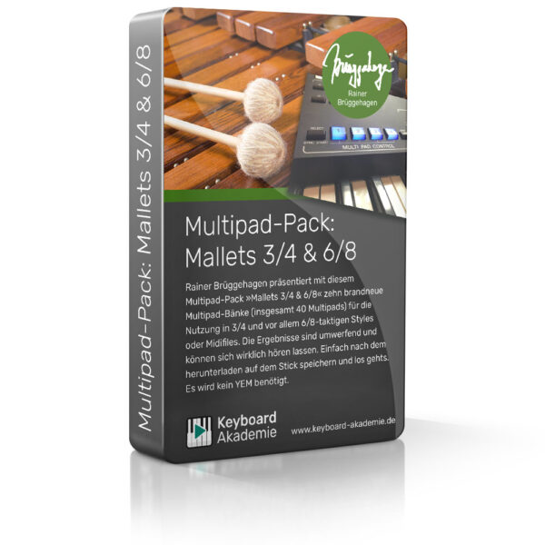 Rainer Brüggehagen präsentiert mit diesem Multipad-Pack »Mallets 3/4 & 6/8« zehn brandneue Multipad-Bänke (insgesamt 40 Multipads) für die Nutzung in 3/4 und vor allem 6/8-taktigen Styles oder Midifiles. Die Ergebnisse sind umwerfend und können sich wirklich hören lassen. Einfach nach dem herunterladen auf dem Stick speichern und los gehts. Es wird kein YEM benötigt.