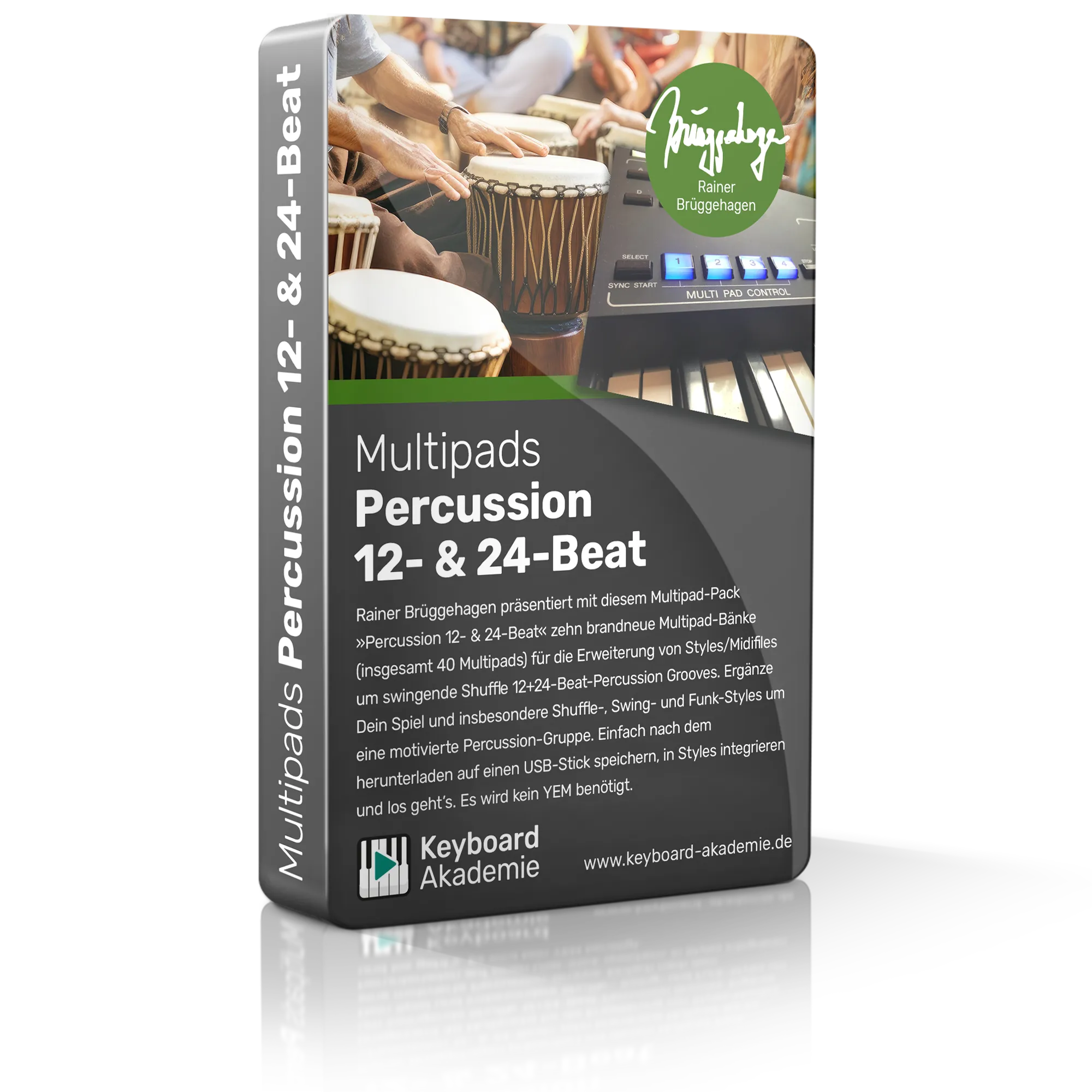 Rainer Brüggehagen präsentiert mit diesem Multipad-Pack »Percussion 12- & 24-Beat« zehn brandneue Multipad-Bänke (insgesamt 40 Multipads) für die Erweiterung von Styles/Midifiles um swingende Shuffle 12+24-Beat-Percussion Grooves. Ergänze Dein Spiel und insbesondere Shuffle-, Swing- und Funk-Styles um eine motivierte Percussion-Gruppe. Einfach nach dem herunterladen auf einen USB-Stick speichern, in Styles integrieren und los geht’s. Es wird kein YEM benötigt.