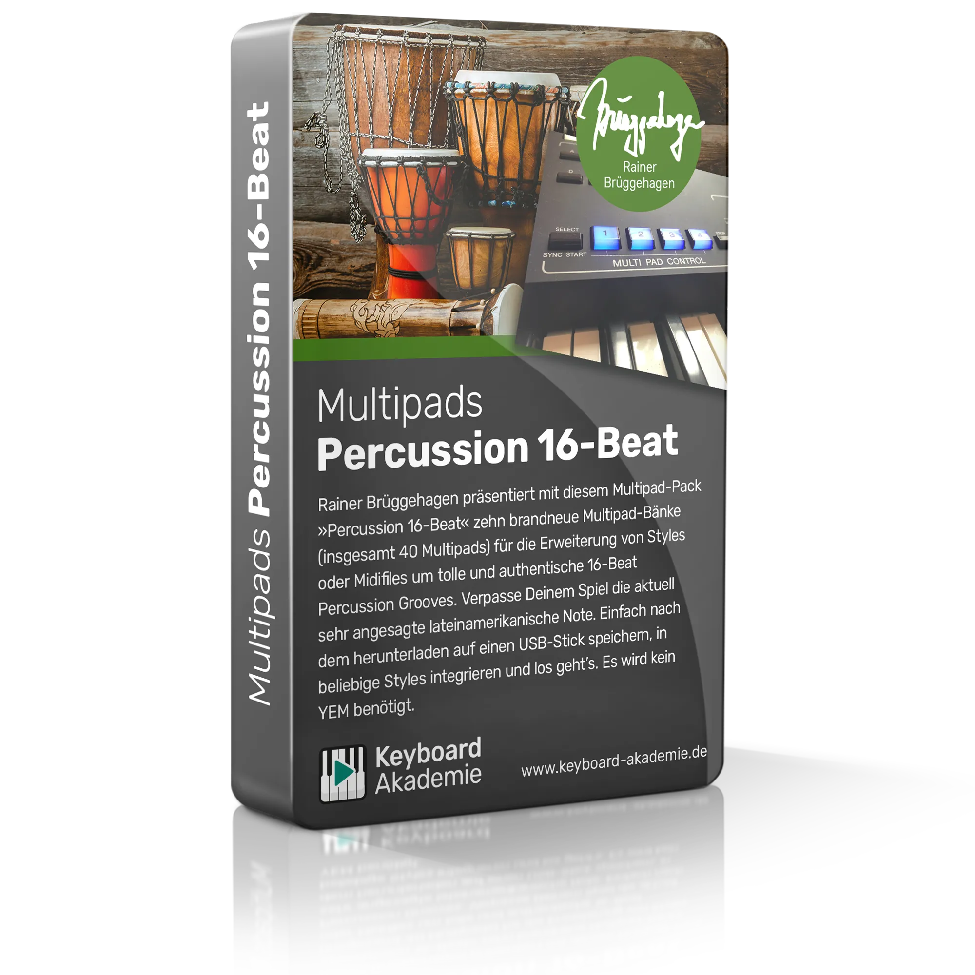 Rainer Brüggehagen präsentiert mit diesem Multipad-Pack »Percussion 16-Beat« zehn brandneue Multipad-Bänke (insgesamt 40 Multipads) für die Erweiterung von Styles oder Midifiles um tolle und authentische 16-Beat Percussion Grooves. Verpasse Deinem Spiel die aktuell sehr angesagte lateinamerikanische Note. Einfach nach dem herunterladen auf einen USB-Stick speichern, in beliebige Styles integrieren und los geht’s. Es wird kein YEM benötigt.