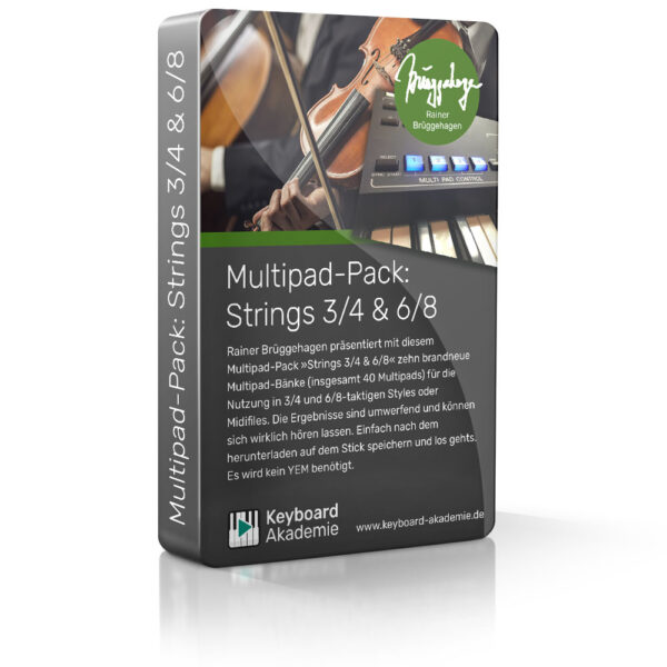 Rainer Brüggehagen präsentiert mit diesem Multipad-Pack »Strings 3/4 & 6/8« zehn brandneue Multipad-Bänke (insgesamt 40 Multipads) für die Nutzung in 3/4 und 6/8-taktigen Styles oder Midifiles. Die Ergebnisse sind umwerfend und können sich wirklich hören lassen. Einfach nach dem herunterladen auf dem Stick speichern und los gehts. Es wird kein YEM benötigt.