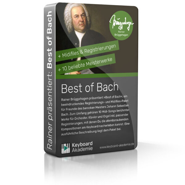 Rainer Brüggehagen präsentiert »Best of Bach«, ein beeindruckendes Registrierungs- und Midifiles-Paket für Freunde des barocken Meisters Johann Sebastian Bach. Zum Umfang gehören 10 Midi-Songs berühmter Werke für Orchester, Klavier und Orgel inkl. passender Registrierungen, mit denen Du die atemberaubenden Kompositionen am Keyboard nacherleben kannst. Eine ausführliche Beschreibung liegt dem Paket bei.