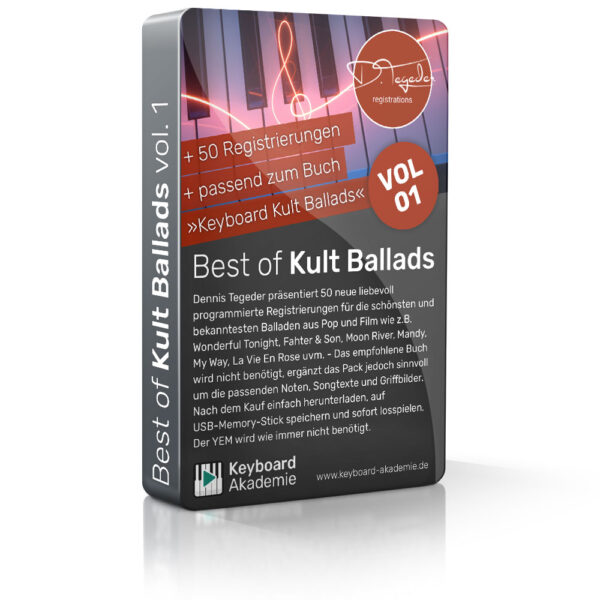 Dennis Tegeder präsentiert 50 neue liebevoll programmierte Registrierungen für die schönsten und bekanntesten Balladen aus Pop und Film wie z.B. Wonderful Tonight, Fahter & Son, Moon River, Mandy, My Way, La Vie En Rose uvm. – Das empfohlene Buch wird nicht benötigt, ergänzt das Pack jedoch sinnvoll um die passenden Noten, Songtexte und Griffbilder. Nach dem Kauf einfach herunterladen, auf USB-Memory-Stick speichern und sofort losspielen. Der YEM wird wie immer nicht benötigt.