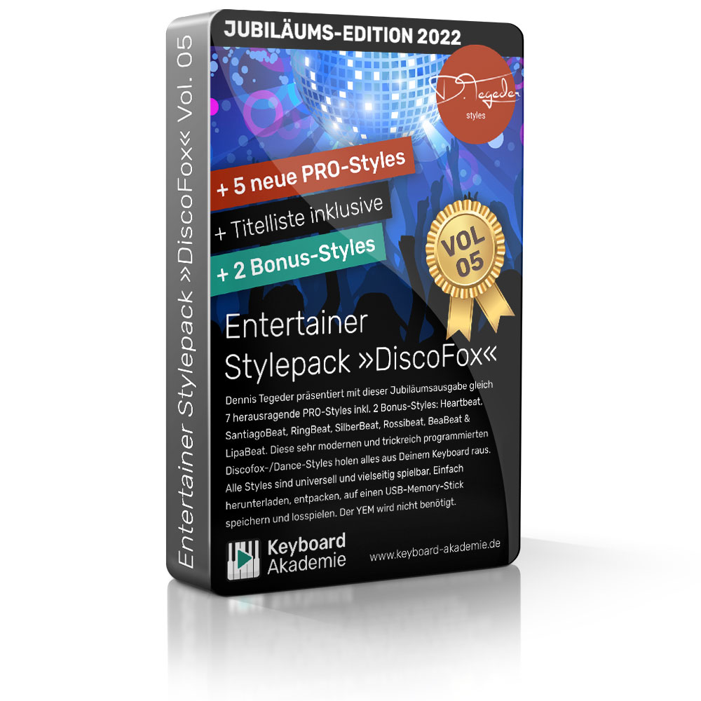 Dennis Tegeder präsentiert mit dieser Jubiläumsausgabe gleich7 herausragende PRO-Styles inkl. 2 Bonus-Styles: Heartbeat, SantiagoBeat, RingBeat, SilberBeat, Rossibeat, BeaBeat & LipaBeat. Diese sehr modernen und trickreich programmierten Discofox-/Dance-Styles holen alles aus Deinem Keyboard raus. Alle Styles sind universell und vielseitig spielbar. Einfach herunterladen, entpacken, auf einen USB-Memory-Stick speichern und losspielen. Der YEM wird nicht benötigt.