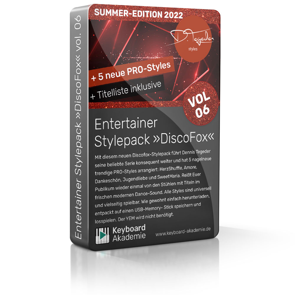 Mit diesem neuen Discofox-Stylepack führt Dennis Tegeder seine beliebte Serie konsequent weiter und hat 5 nagelneue trendige PRO-Styles arrangiert: HerzShuffle, Amore, Dankeschön, Jugendliebe und SweetMaria. Reißt Euer Publikum wieder einmal von den Stühlen mit Titeln im frischen modernen Dance-Sound. Alle Styles sind universell und vielseitig spielbar. Wie gewohnt einfach herunterladen, entpackt auf einen USB-Memory-Stick speichern und los spielen. Der YEM wird nicht benötigt.
