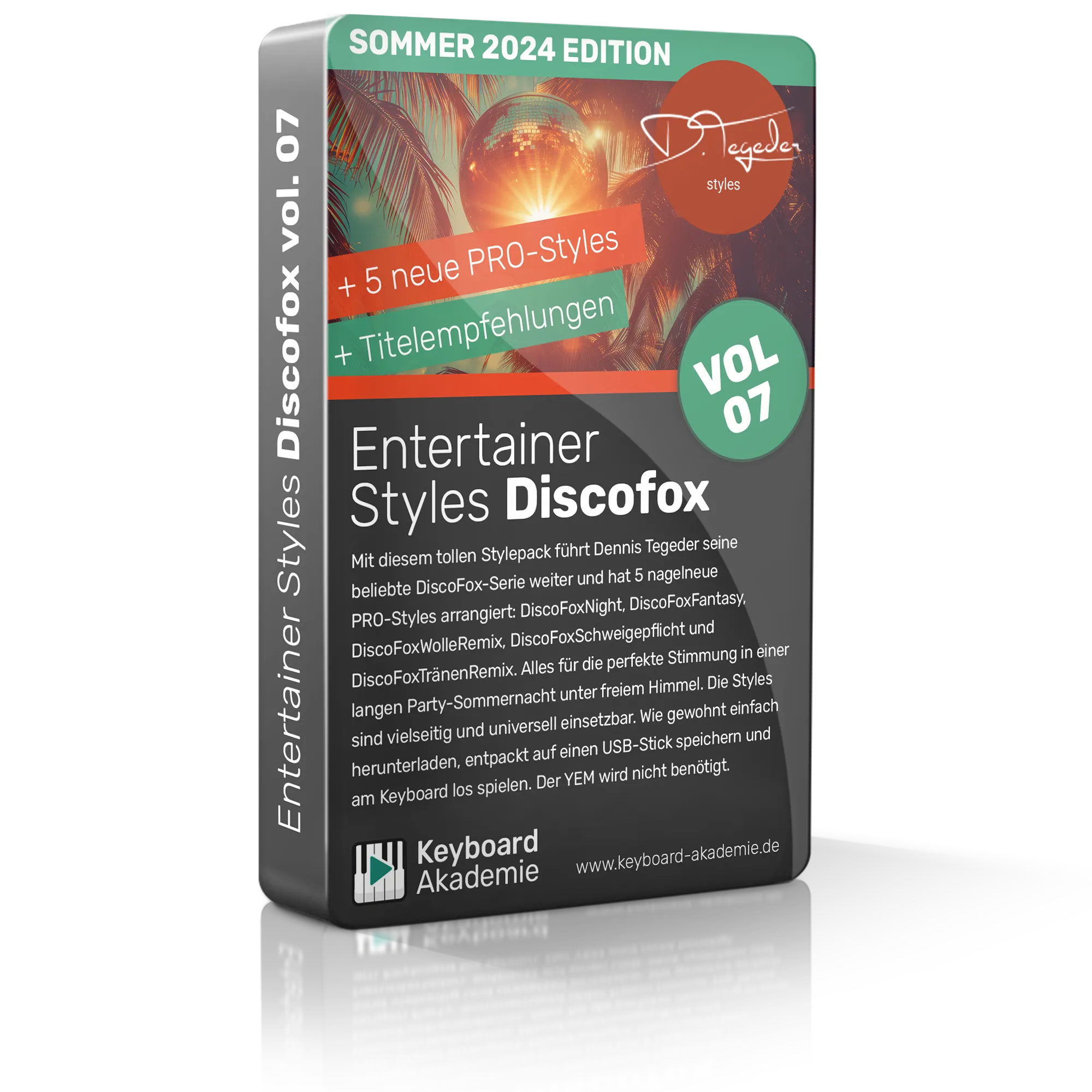 Mit diesem tollen Stylepack führt Dennis Tegeder seine beliebte DiscoFox-Serie weiter und hat 5 nagelneue PRO-Styles arrangiert: DiscoFoxNight, DiscoFoxFantasy, DiscoFoxWolleRemix, DiscoFoxSchweigepflicht und DiscoFoxTränenRemix. Alles für die perfekte Stimmung in einer langen Party-Sommernacht unter freiem Himmel. Die Styles sind vielseitig und universell einsetzbar. Wie gewohnt einfach herunterladen, entpackt auf einen USB-Stick speichern und am Keyboard los spielen. Der YEM wird nicht benötigt.
