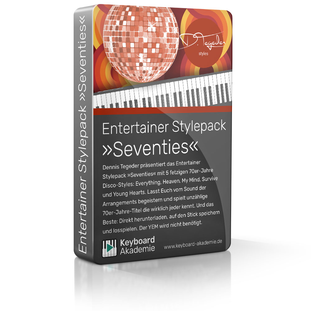 Dennis Tegeder präsentiert das Entertainer Stylepack »Seventies« mit 5 fetzigen 70er-Jahre Disco-Styles: Everything, Heaven, My Mind, Survive und Young Hearts. Lasst Euch vom Sound der Arrangements begeistern und spielt unzählige 70er-Jahre-Titel die wirklich jeder kennt. Und das Beste: Direkt herunterladen, auf den Stick speichern und losspielen. Der YEM wird nicht benötigt.